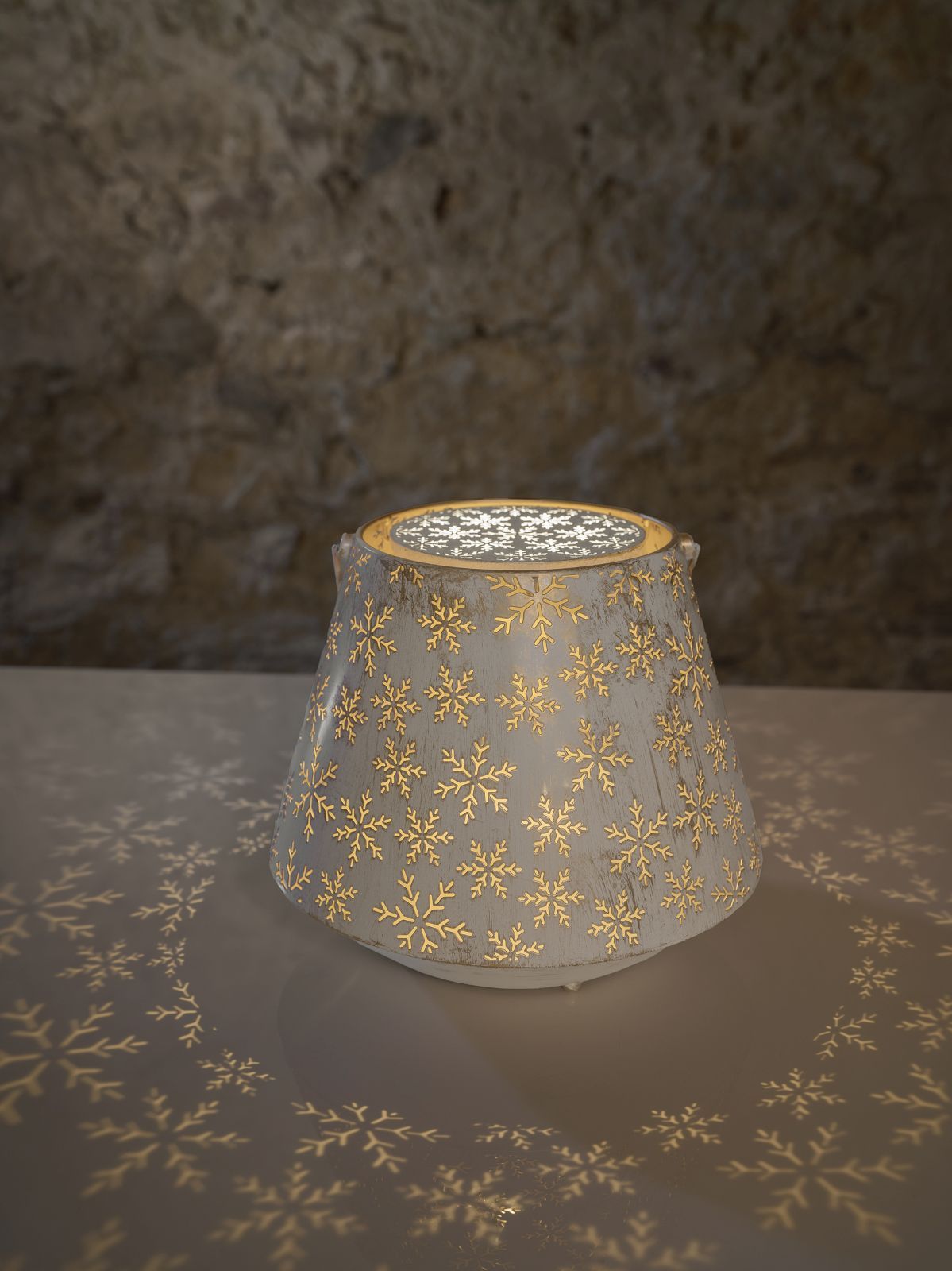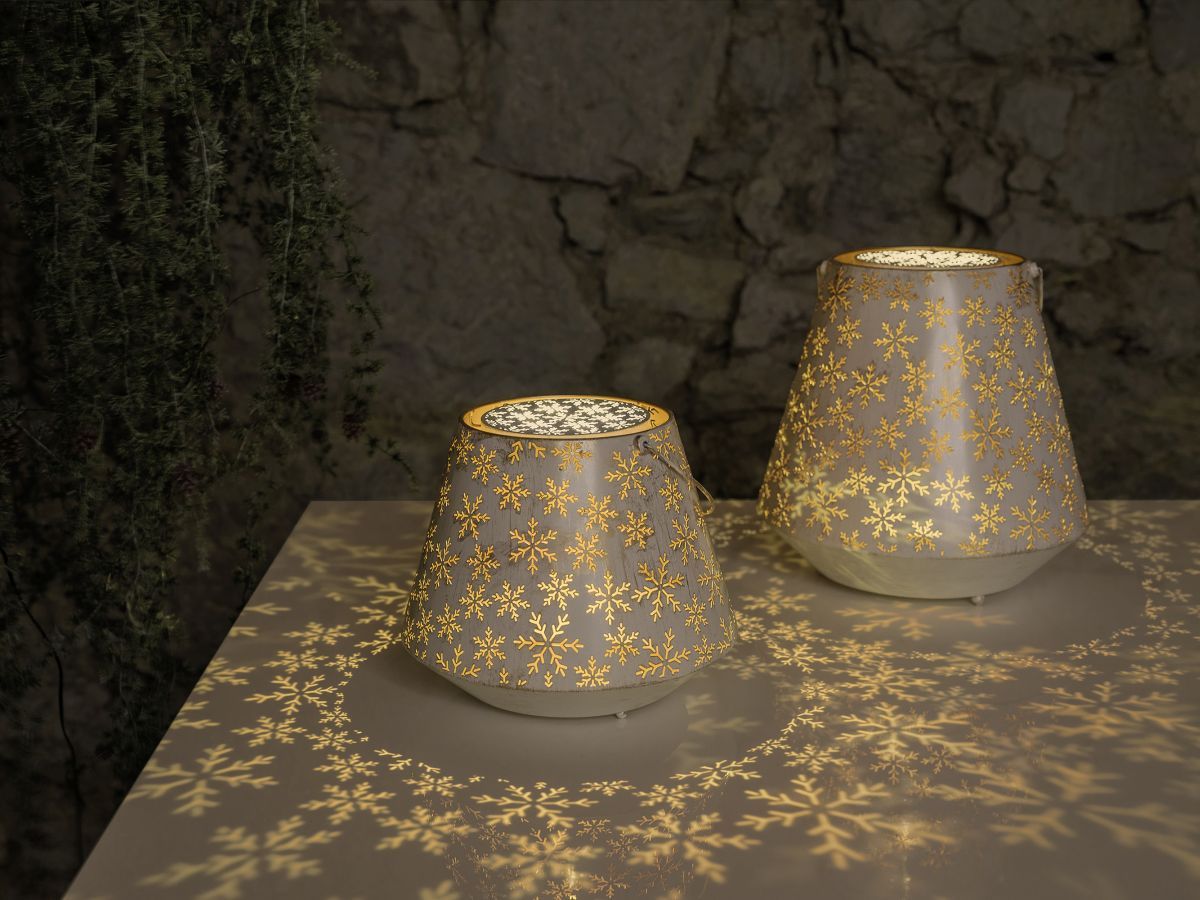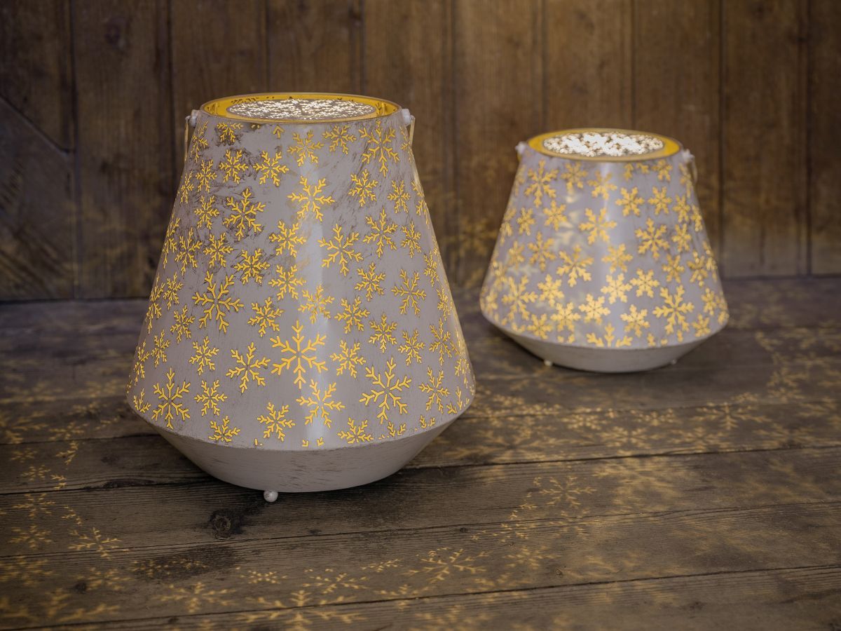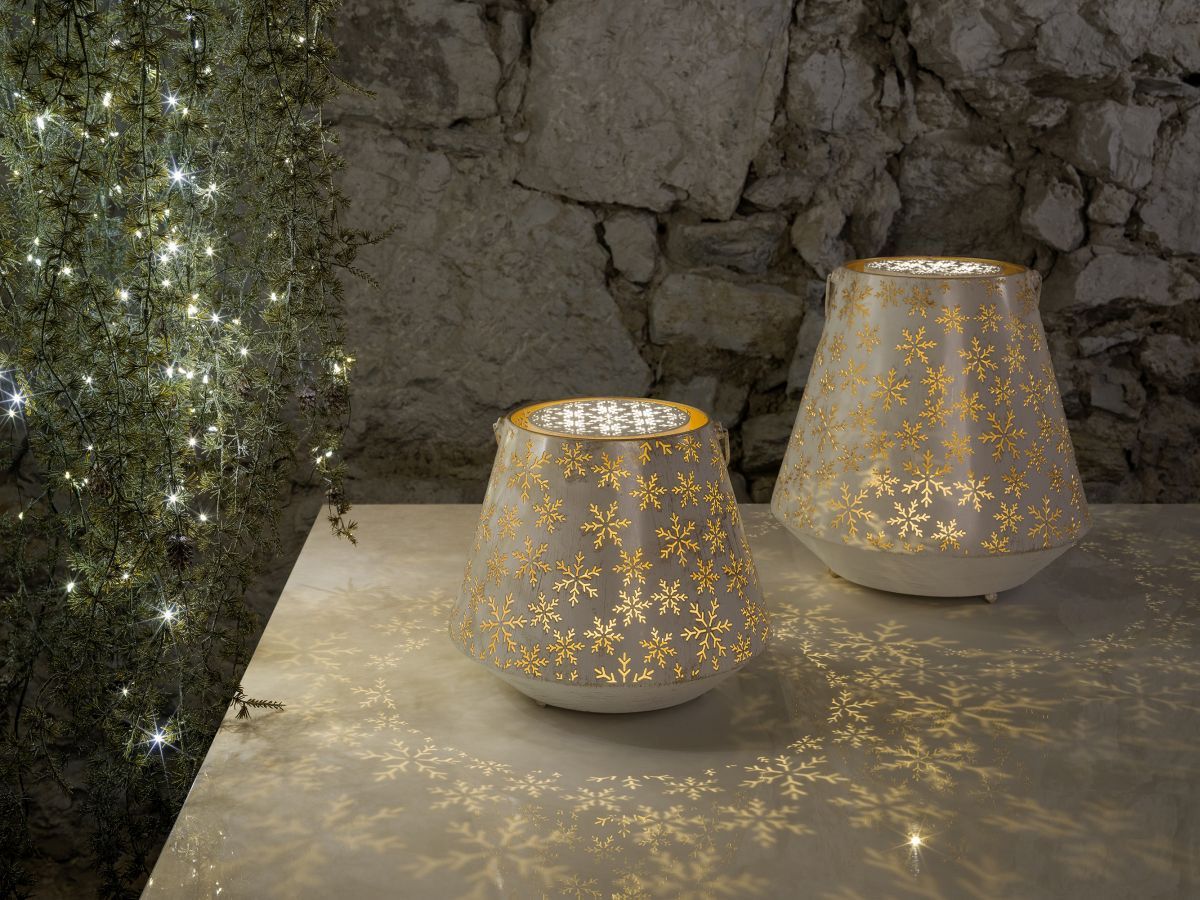 Laterne mit eleganter weiss/gold Nova Flocke Optik, eignet sich für den Innen- und Ausseneinsatz. Nach dem Einschalten leuchtet das Produkt für 6 Stunden, schaltet sich für 18 Stunden aus und startet dann wieder für weitere 6 Stunden.